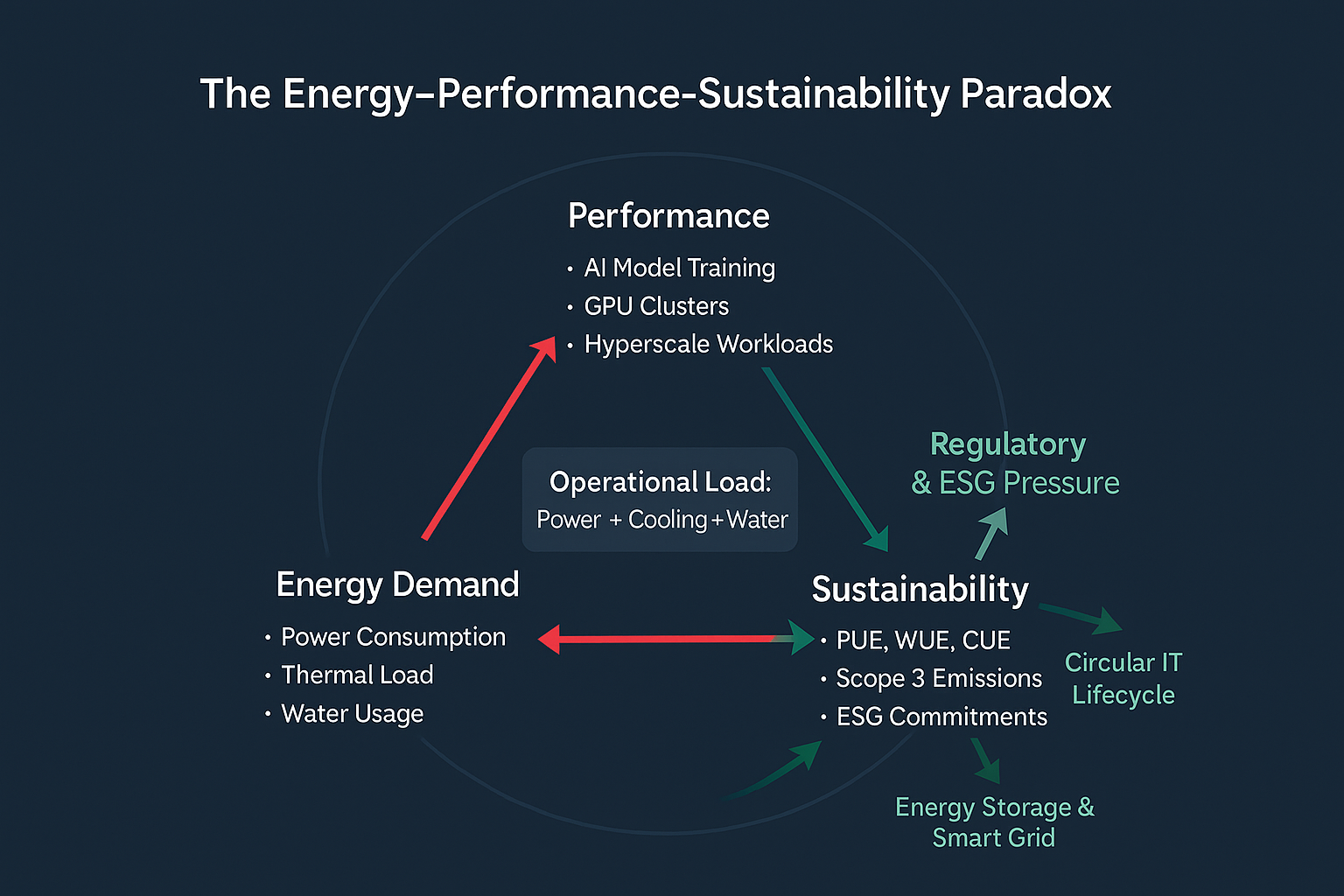 This computational intensity increases power density, thermal load, and water consumption — all of which amplify the sustainability burden. Every hardware refresh, every GPU cluster, every additional megawatt of compute power brings the performance-energy paradox into sharper focus: every gain in capability adds strain to the planet.