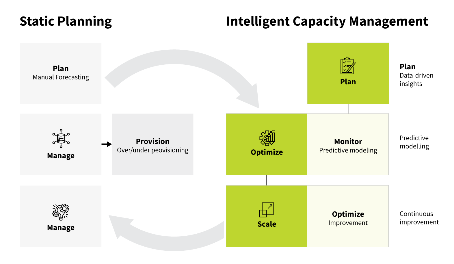 This is where AI-driven data center capacity management makes a critical difference. By leveraging machine learning algorithms, data centers can predict power surges, cooling inefficiencies, and network bottlenecks before they occur. AI continuously analyses patterns in energy consumption, workload distribution, and thermal behaviour, enabling autonomous optimisation of resources in real time. Instead of overprovisioning, an approach that drives up operational costs — AI ensures resources are allocated dynamically based on live demand and predictive insights.