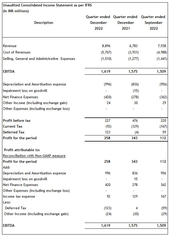Sify reports Consolidated Financial Results for Q3 FY 2022-23 Revenues of INR 8,896 Million. EBITDA of INR 1,619 Million.