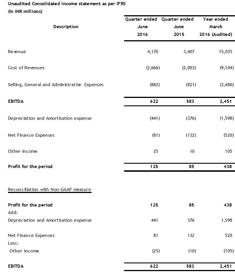 Chennai, Wednesday, July 20, 2016: Sify Technologies Limited (NASDAQ: SIFY), a leader in Managed Enterprise, Network, IT and Applications services in India with global delivery capabilities, today announcedits consolidated results under International Financial Reporting Standards (IFRS) for the first quarter of fiscal year 2016-17.